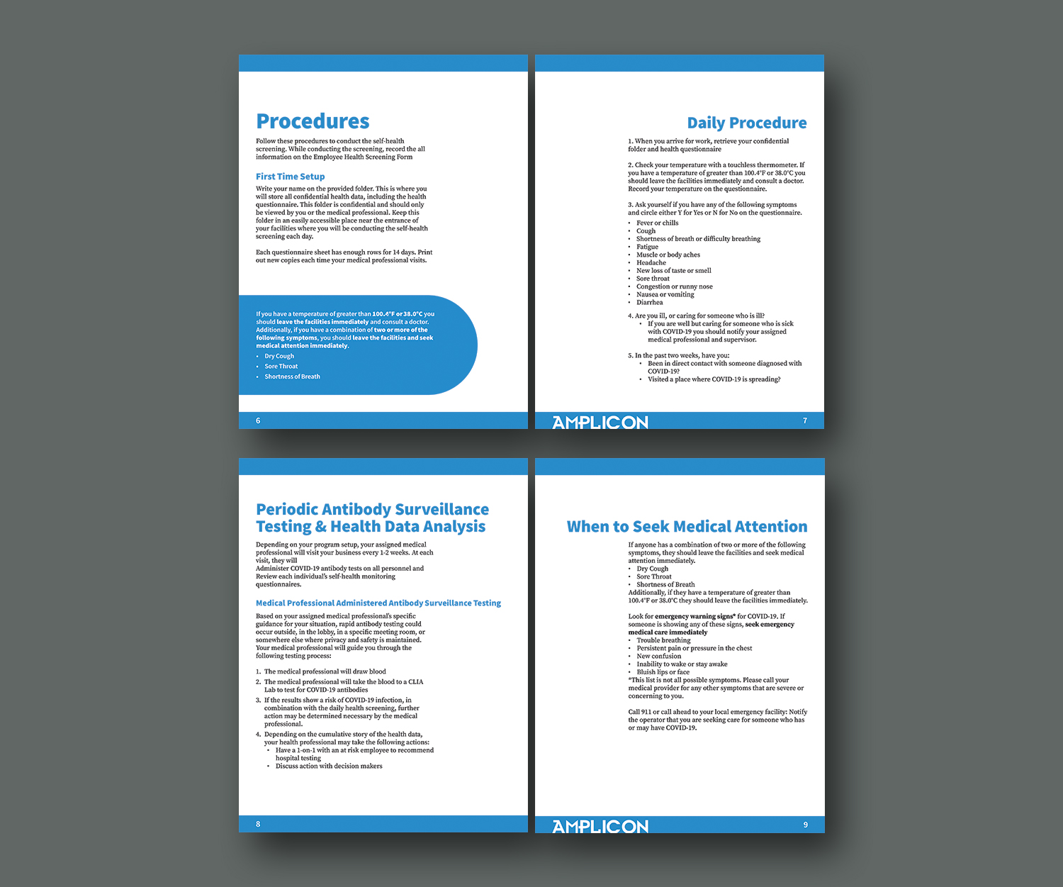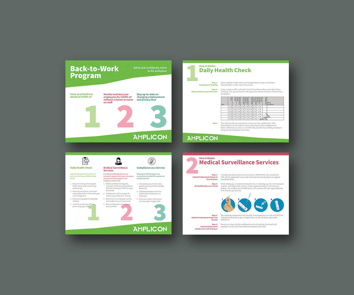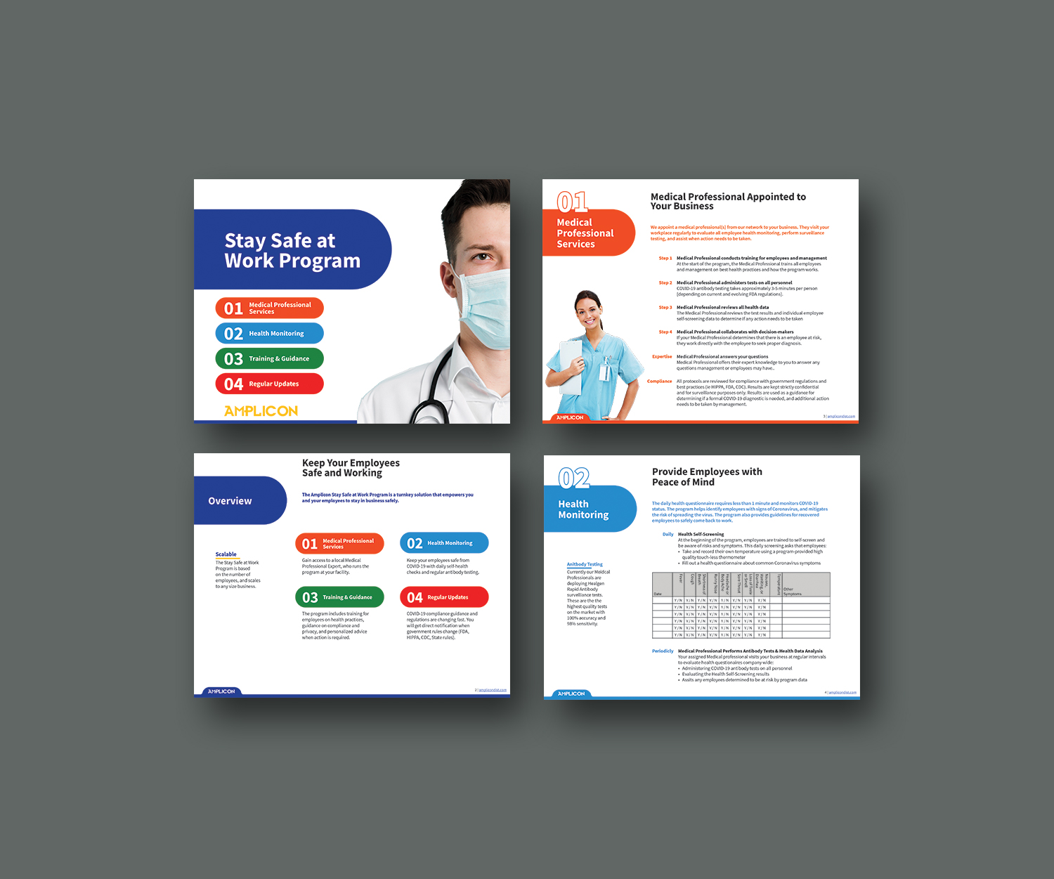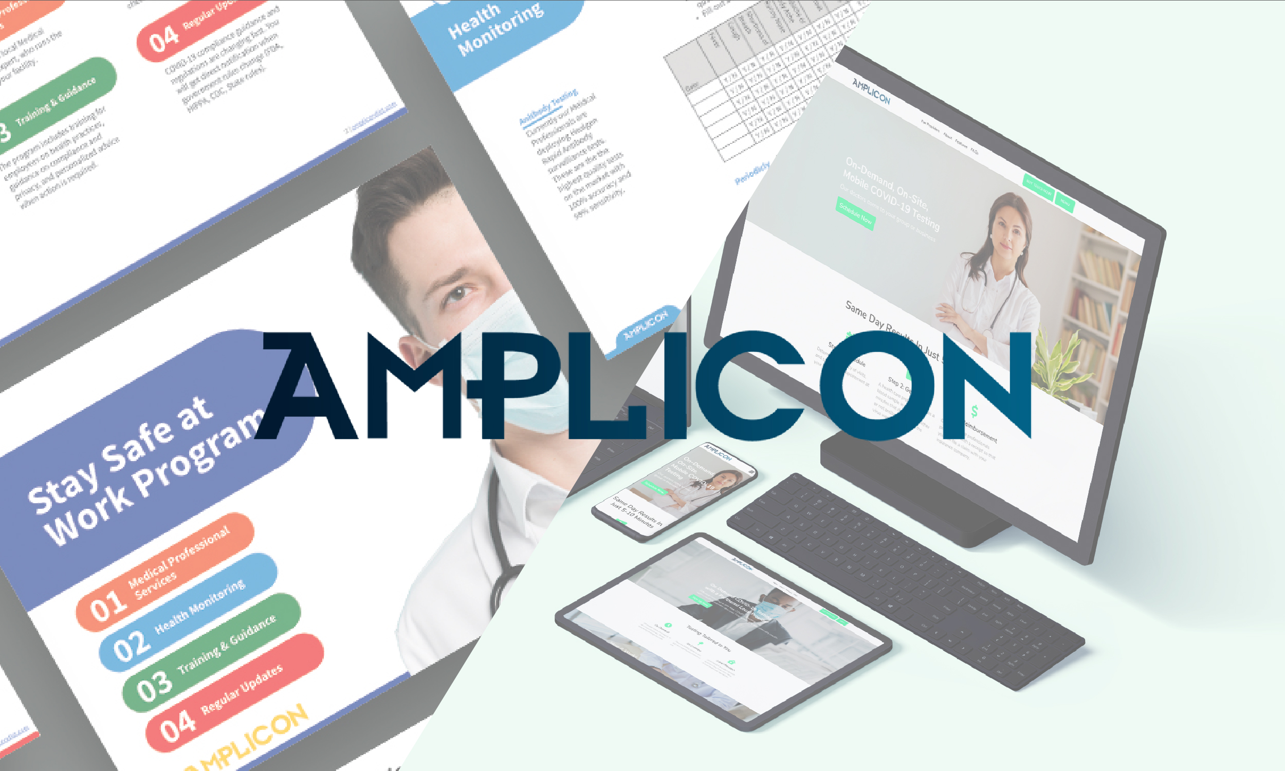 As a designer and IT lead at Amplicon, I was the only employee focused entirely on all design and implementation of those designs. I frequently found myself working in Adobe, Illustrator, InDesign, and XD to work on my projects and reported to two managers who were primarily focused on other business functions. In this system my workflow was to first receive an assignment with some specs, create and review an initial concept with my managers, then execute the concept. My work was split between two sub-brands of Amplicon: AmpliconDist, and OnSiteCovid19Test.