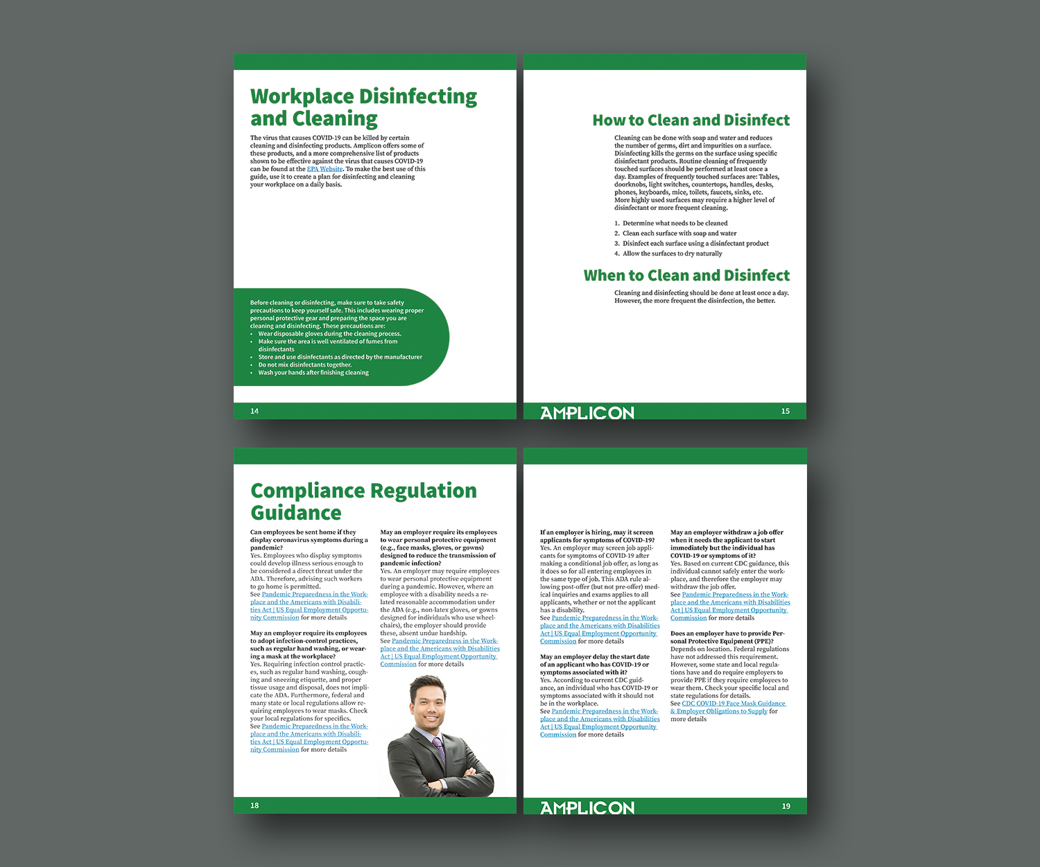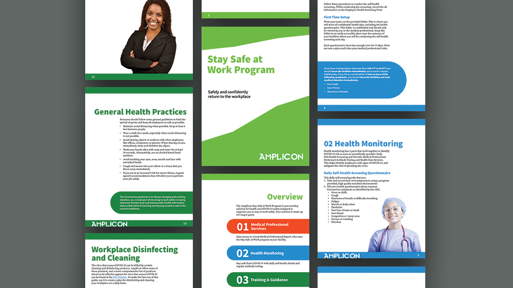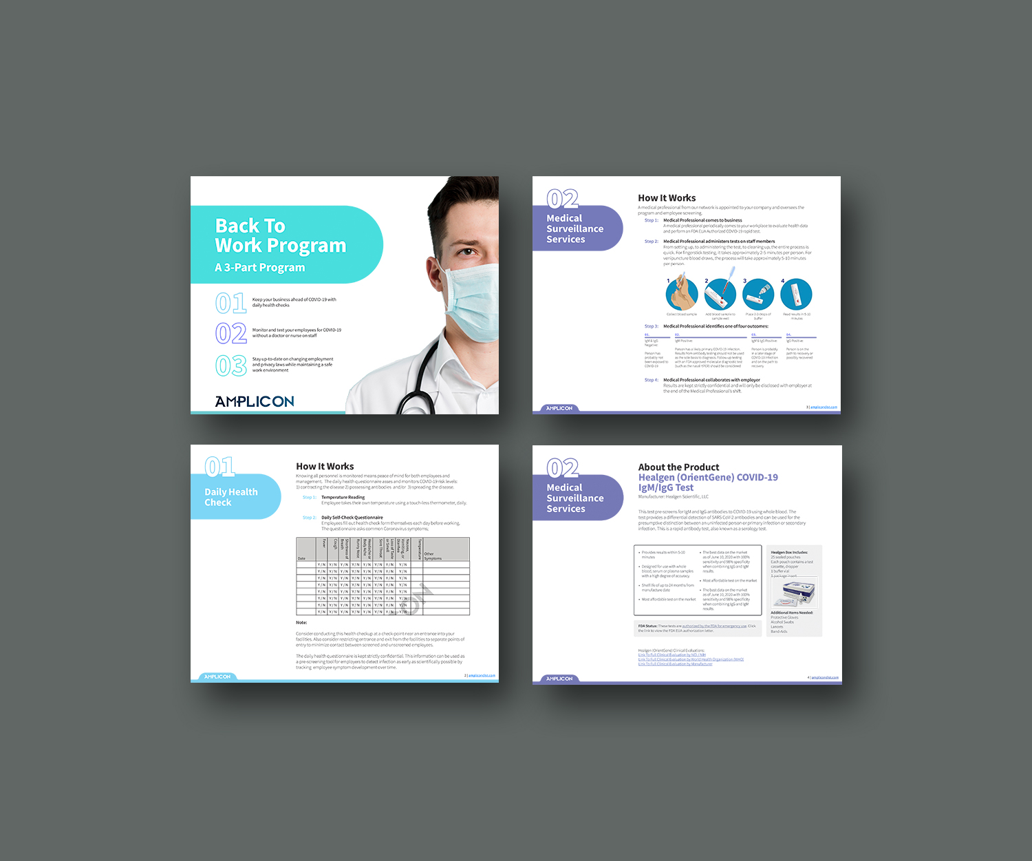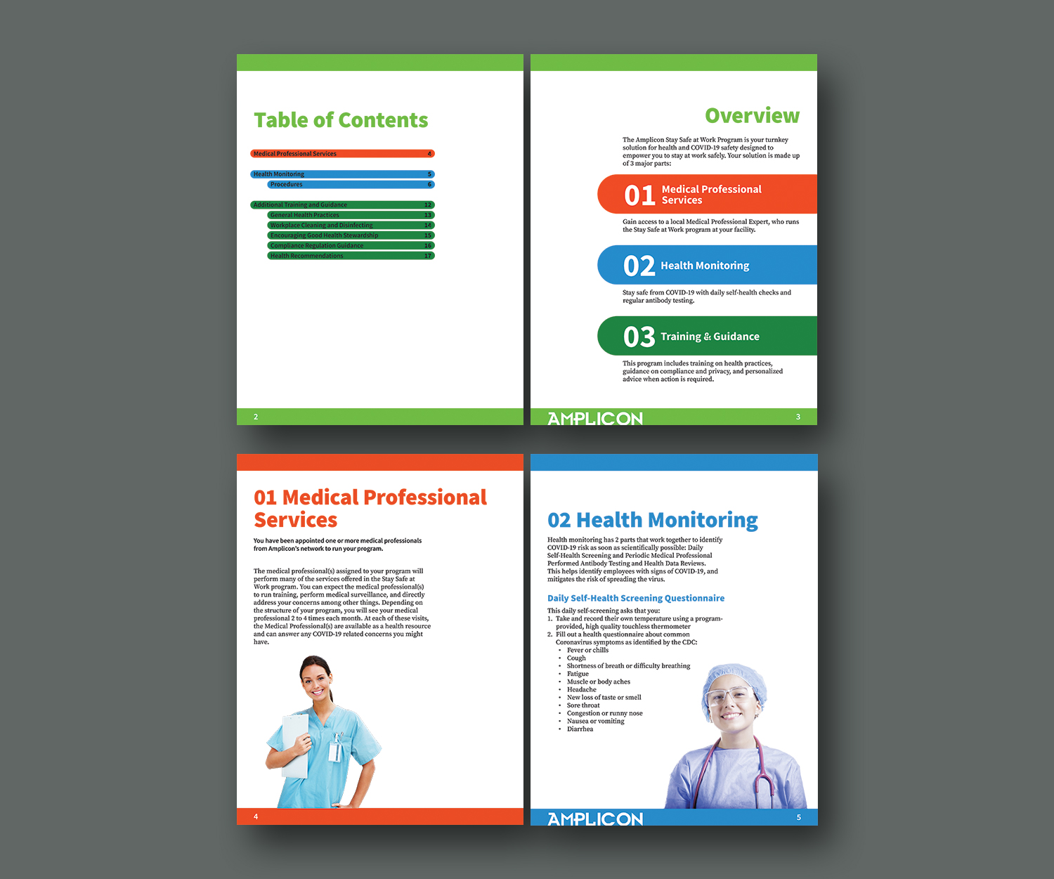 As a designer and IT lead at Amplicon, I was the only employee focused entirely on all design and implementation of those designs. I frequently found myself working in Adobe, Illustrator, InDesign, and XD to work on my projects and reported to two managers who were primarily focused on other business functions. In this system my workflow was to first receive an assignment with some specs, create and review an initial concept with my managers, then execute the concept. My work was split between two sub-brands of Amplicon: AmpliconDist, and OnSiteCovid19Test.